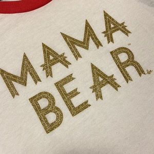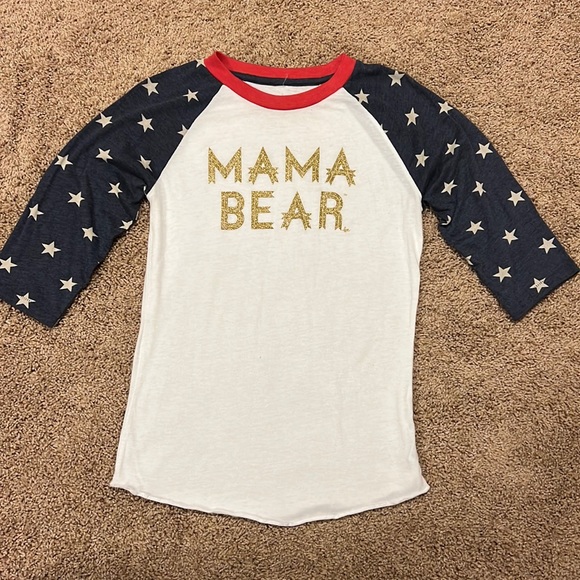 Red, white and blue mama bear baseball tee. Star sleeves and gold glitter writing.