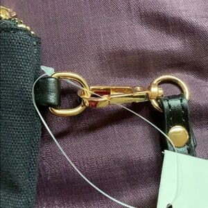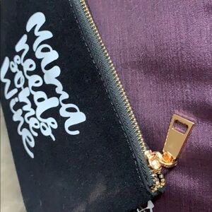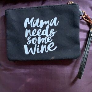 This adorable wristlet is black canvas with white paint on both sides. Gold hardware. Removable strap. Great size. Great gift! Measures approximately 8.5 by 6 inches.