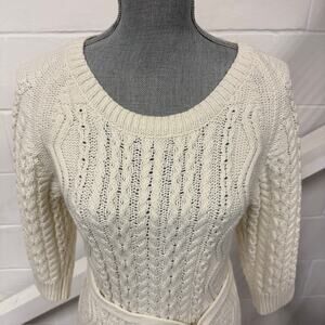 • Chunky cable knit. 3/4 sleeves. Crewneck. Belted tie waist. Pulls on. Midi length.