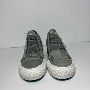 Trendy gray low-top sneakers with a rugged design. Features a white sole and zipper details.