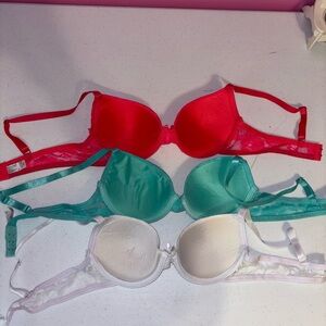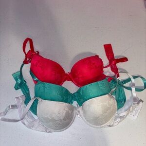 Stylish lace bras by Mamia. Features bold red, refreshing green, and classic white. Perfect for everyday elegance.