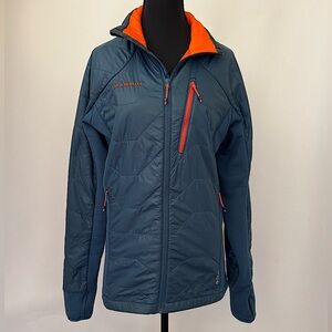 This high-performance greyish dark blue jacket is designed for demanding outdoor activities like mountaineering, climbing, hiking, camping, and backcountry touring, especially in cold and varying conditions. Approximate flat measurements; length 26”, armpit to armpit 20”, sleeve length 25”