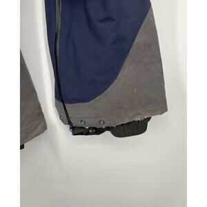 Bottom of legs (front and back) and have various signs of wear and discoloration. Vents and zippers still function. Various discoloration throughout. Stain on knee.