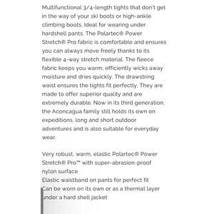 Multifunctional 3/4-length tights that don't get in the way of your ski boots or high-ankle climbing boots. Ideal for wearing under hardshell pants. The Polartec® Power Stretch® Pro fabric is comfortable and ensures you can always move freely thanks to its flexible 4-way stretch material. The fleece fabric keeps you warm, efficiently wicks away moisture and dries quickly. The drawstring waist ensures the tights fit perfectly. They are made to offer superior quality and are extremely durable. Now in its third generation, the Aconcagua family still holds its own on expeditions, long and short outdoor adventures and is also suitable for everyday