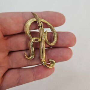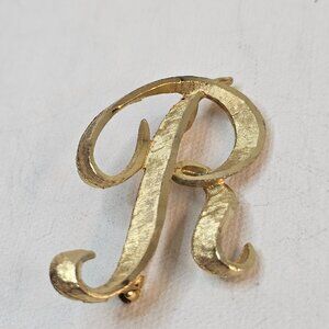 Mamselle Letter R Initial Brooch Gold Tone Monogram Script Retro Brushed Jewelry