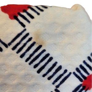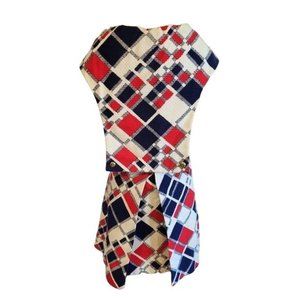 Wonderful retro mod nautical geometric dress. This stunning piece is made by Mam'selle by Betty Carol. Nice heavier material. zbright vibrant red, white, and blue. Cool collar and double breasted pea coat style front. Has all the button but could button them all up. Dress is in good shape but does have two minor stains as pictured. One on collar and other on lower dress. Top two buttons could be reinforced.