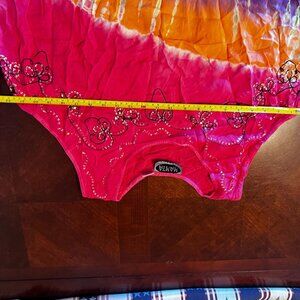 keywords: This beautiful Mamta women's dress is a vibrant, boho-style piece perfect for beach days, festivals, or casual summer outings. Made from 100% lightweight rayon, it features a striking tie-dye design in bold shades of pink, orange, and purple, with intricate hand-embroidered floral details and sparkling sequin accents. The flowy, free-size cut offers a relaxed fit, making it a versatile addition to any wardrobe.