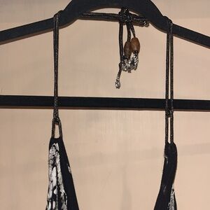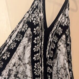 Gorgeous fabric, jagged edge dress. Measurements pit to pit is 20” inches. Free open back deep V in front. Embroidery is shiny, nice against black and gray material. Length at shortest front then back V’s is 27” inches 20” inches. Smoke and pet free home, freshly washed and air dried.
