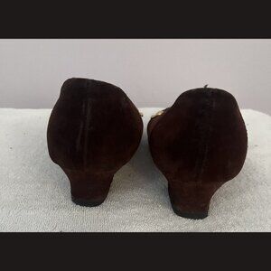 The product is a pair of women's strappy heels in brown suede, featuring a kitten heel style. The shoes are designed with a size 9 US shoe size. The upper material is made of suede, giving the shoes a luxurious and elegant appearance. Perfect for adding a touch of sophistication to any outfit, these heels are a stylish choice for formal occasions or everyday wear.