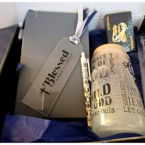 This set includes a faith-themed journal, a matching pen, Bookmark, an inspirational frosted tumbler, and playing cards. Ideal for spiritual reflection and daily motivation.