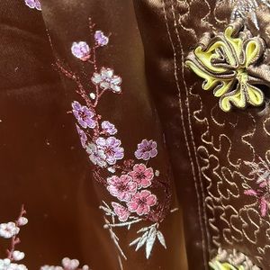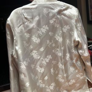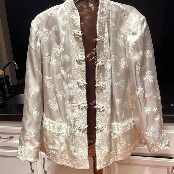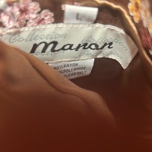 Manan Collection Large 50% Rayon 50% Polyester Label is in pocket it to be seen when you reverse. Cream color inside with floral print. Pockets on both sides. Beautifully made.