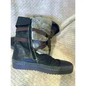 Manas Rabbit Fur & Brown Leather Women's Boots. Designed with straps, and zipper on the inside leg. The flat heel style ensures comfort. The brown color and fur lining material great for warm and fashion. With a US Shoe Size of 8.5 and EU Shoe Size of 39, these boots are a great fit for any woman. The leather upper material is of high quality and will ensure long-lasting wear. There is creasing on the boots, otherwise in good shape. Measurements are - 1 1/2 inch platform - 10 1/4 inch from toe to heel - 3.5 inch wide - 10 inch height from bottom to top of Boot.