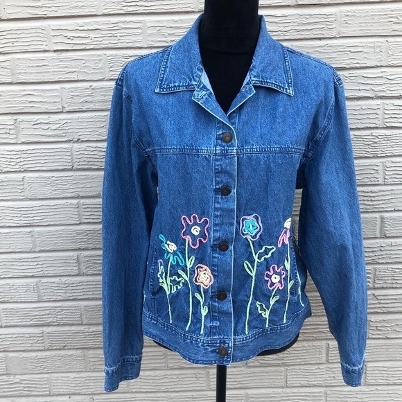 Mandal Bay Medium Wash Denim Blue Jean Jacket with Ribbon Flowers Size L