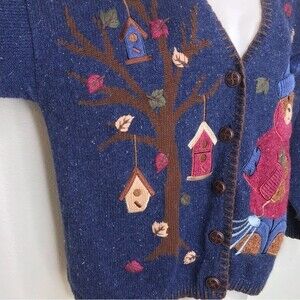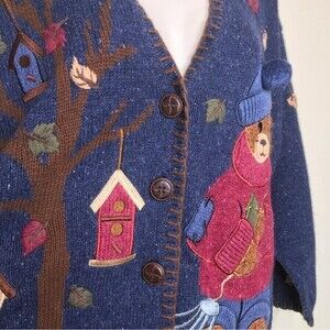 Mandal Bay Vintage Teddy Bear Raking Leaves V Neck Button Front Cardigan