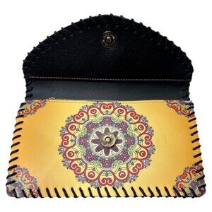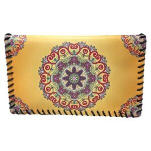 Excellent condition with strap in original packaging. Add a touch of elegance with this vibrant yellow clutch featuring a stunning mandala design. Perfect for any occasion.