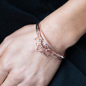 Brushed in a high sheen finish, an airy mandala-like frame crowns the top of a dainty rose gold cuff for a whimsically seasonal flair.