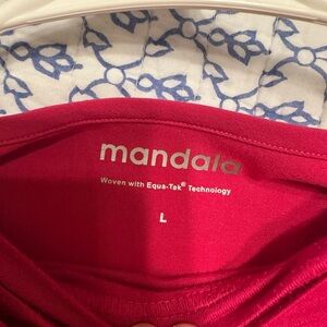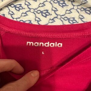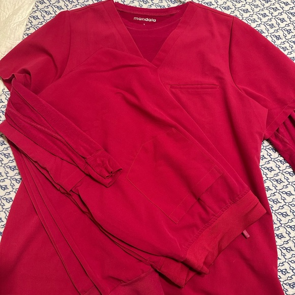 Mandala scrub set in vibrant pink. Includes one pocket scrub top, underscrubs, and regular jogger scrub bottoms. All size L.