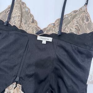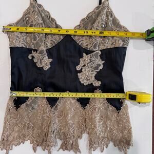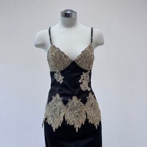 Turn heads in this Mandalay Y2K, low v-neck, size 8, top & midi-skirt set, featuring a stunning mix of embellished pearls, beads, sequins on a sleek black polyester-spandex base. The dress showcases delicate lace trim with intricate pearl beading. Perfect for weddings, formal, cocktail parties, or any special occasion. Signs of wear, worn a few times.