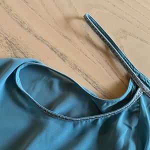 Aqua V-Neck Blouse in size medium by Mandee. This cute top has Rhinestones on the straps, sleeves and neckline. The sleeves are bell shaped, length is a little longer in the back than the front. New never worn with original tags in excellent condition.