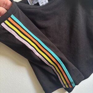 Trendy Mandee cropped cami in sleek black with colorful rainbow side stripes for a sporty, 90s-inspired vibe.