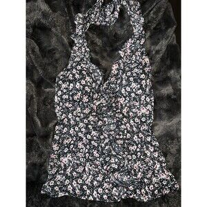 Mandee Ruffle Halter Top Womens L Black Floral Tie Neck Blouse Babydoll Y2K