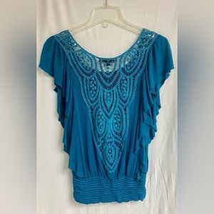 Large Mandee blue top. Ruffles along side, front and back. Cinched at waist. Knit lace design on back.