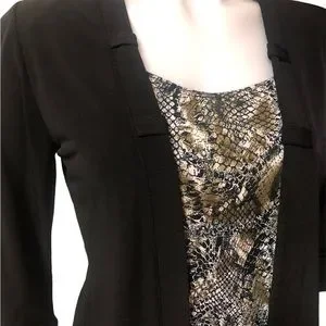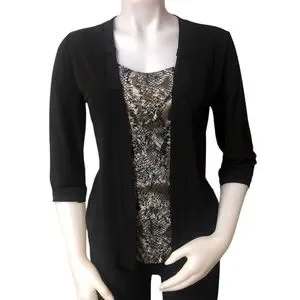 Mandee top. No size tag but I would say it’s a woman’s size S/M. Snakeskin and quarter sleeve black cover. Shirt and cover top are connected. Smoke free home.