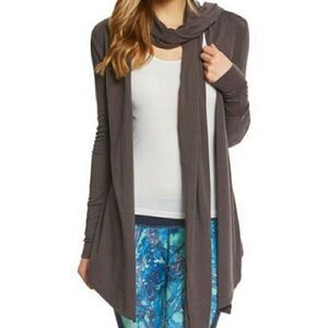 Manduka yoga cardigan with scarf tie neck that can be worn a variety of ways. Open front, long length. Excellent condition. Color is a grayish brown.