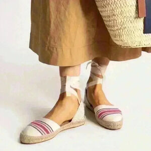 Manebi Hamptons Striped Canvas Espadrilles With Ankle Ties In Tan Size 39/9 NWOT
