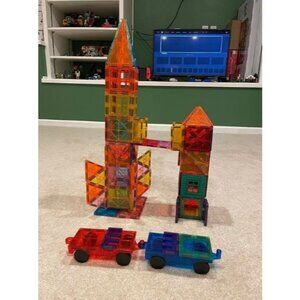 Magnetic Tiles Set: 100PCS including 94 basic shapes, 2 car bases, and 4 click-ins , with a beautiful box and idea book. Perfect for hours of creative play and STEM learning