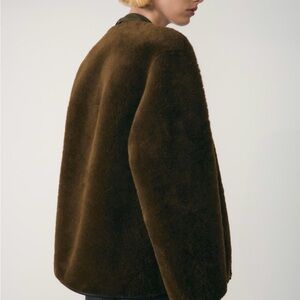 Faux shearling fabric. Straight design. Oversize design. Round neck. Long sleeves. Two front pockets. Toggle button fastening. Contrast trims. Inner lining.