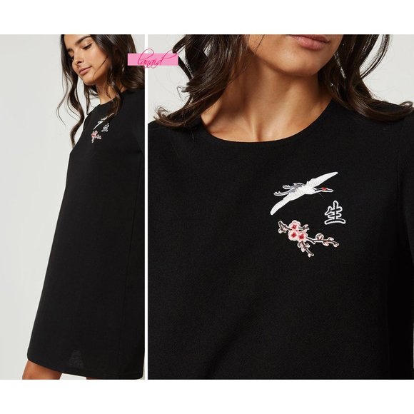 Mango "Patches Detail Dress" in Black, size XS. Sold out everywhere! Gently pre-owned. Asian/Oriental/Chinese/Japanese soaring crane, cherry blossom, and Chinese/kanji character for "life" patches on front chest. Short sleeves. Thicker, stretchy knit polyester/elastane blend fabric. Easy throw-on-and-go piece!