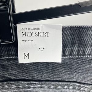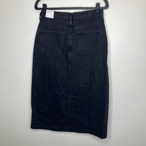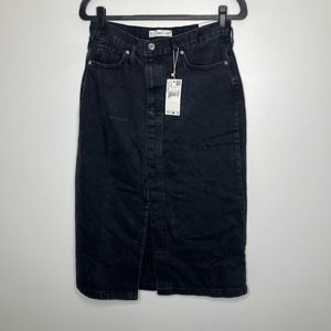 Chic black midi skirt. Features a front slit. Perfect for versatile styling.
