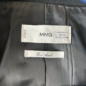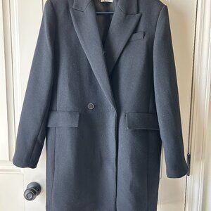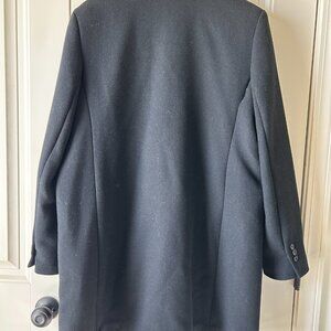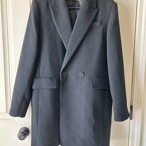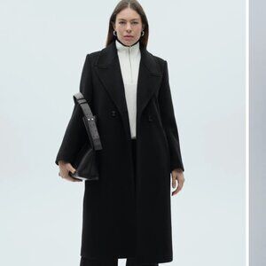 Elegant black pea coat. Double-breasted design. Perfect for a sophisticated look.