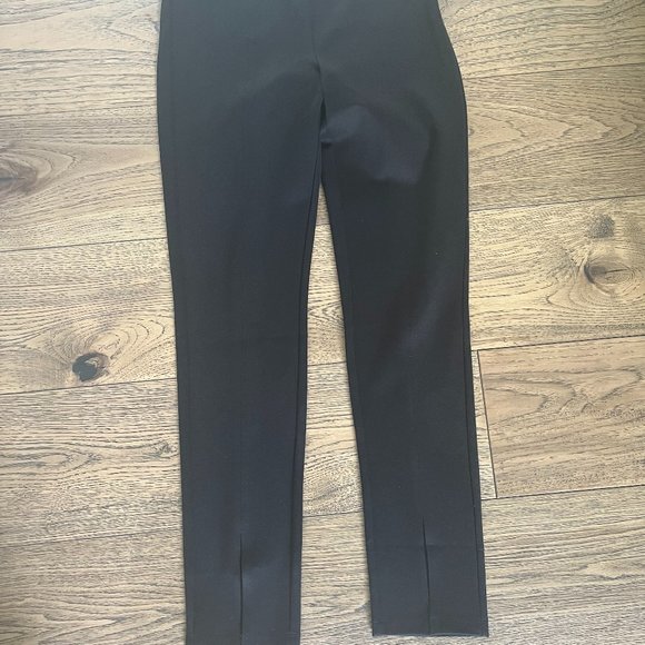 These beautiful black straight leg stretch pant are in excellent condition.; worn only once. The material is 69% viscose, 26% polyamide and the waist is elastic measuring 30 inches, the length from the inseam is 29 in. The front slit is 5 in.
