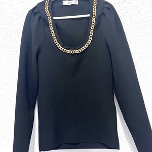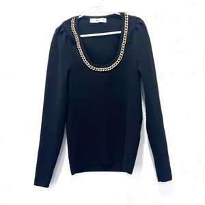 A black long-sleeved top featuring a prominent gold-toned chain detail around the neckline.