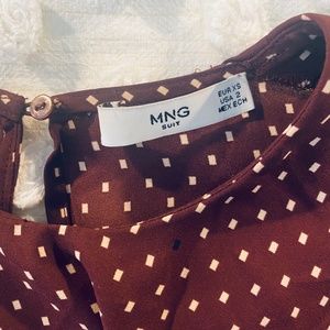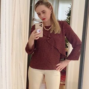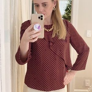 Burgundy/maroon blouse from Mango's suit collection. Cream polka-dot pattern, decorative diagonal ruffle with a keyhole closure at the back. In great condition. Worn once or twice. Non-smoking, no pet home.