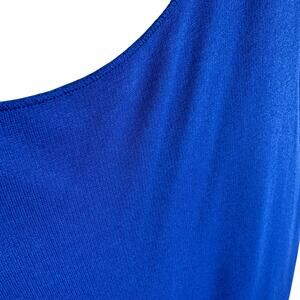 Excellent preowned condition. Blue lightweight scoop neck sleeveless criss cross back pullover knee length dress. Pleating around waist & has elastic. Viscose/polyester/elastane material. Approx. measurements: Shoulder to hem 37", pit to pit 18", waist across 13.5" (elastic). Size 6.