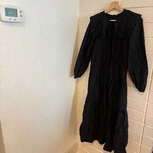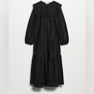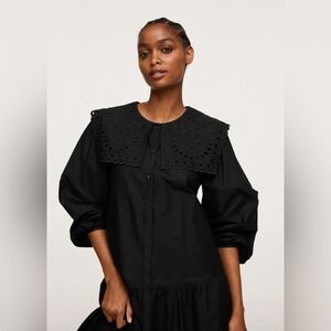 100% Cotton, Midi design, Flared design, Baby doll neck, Swiss embroidery on the collar, Long puffed sleeves, Elastic cuffs, Frill on the bottom, Broderie anglaise ruffle.