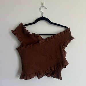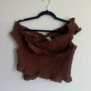 Elegant brown crop top with off-shoulder design. Features stylish ruffle accents.