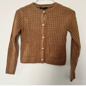 Chic camel knit cardigan by Mango. Features a textured design with button closure. Ideal for layering.
