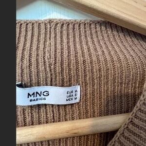 Mango Camel Sweater Size Small. It has been worn 3 or 4 times. Higher neckline. Fit is true to size. Sleeves are raglan and a little billowy. Very soft. I cut the care label out so not 100% sure of the fabric, but it is thicker sweater. I have used the handwash cycle to wash it, and had no issues. It's a little wrinkled from being in my drawer, but condition is good, no known flaws. Can dress it up or down.