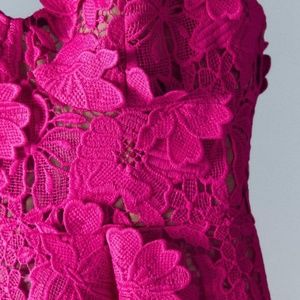 Guipure is reinvented in pink to achieve its most flattering version. This lace-like fabric, but thicker, includes a mesh base and pattern fragments, making it a unique piece. Guipure lace. Corset style. Evasé design. Sweetheart neckline. Thin straps. Zip fastening on the back section.