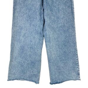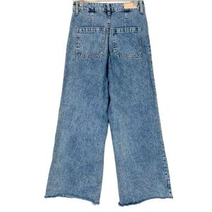 Features: acid wash denim cotton fabric. High waist. Wide leg ankle cropped length with raw hem. Pockets. Zip to button closure.