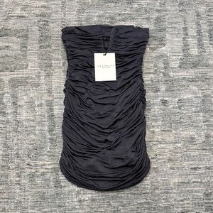 The Jen Ceballos x Mango Black Ruched Strapless Bodycon Mini Dress in size M is a chic and stylish choice for parties or cocktail events. Made from polyester mesh fabric, this dress features a solid black color with ruched accents that add a touch of elegance. The sleeveless design, plunge neckline, and short length make it perfect for the summer and spring seasons. The classic bodycon style flatters the figure, making it a must-have addition to any woman's wardrobe.