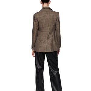 Checked print. Straight design. Lapel-collar. Long sleeve with buttoned cuffs. Shoulder pad. Button fastening on the front section. Decorative pockets. Back-slit hem. Inner lining. Blazer style.