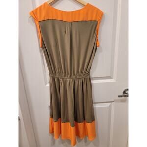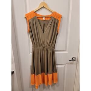 Y2K colorblock dress features a green knit body with elastic waist, peach chiffon trim hem and shoulders, rolled shoulders. Pleated front shoulder, v-neck relaxed fit sleeveless dress is perfect for the office, Brunch or casual outings. Slight cosmetic wear hidden in pleats.