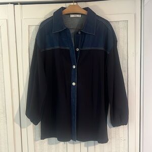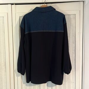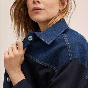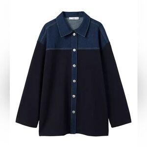 Combined fabric. Front closure. Standard design. Heavy structure. Fabric with cotton. Denim fabric. Oversize design. Shirt-style collar. Long sleeve. Button fastening on the front section.