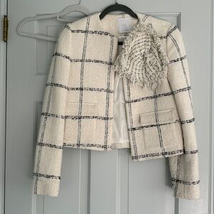 Chic plaid blazer with a stylish fringe detail. Perfect for a polished look.