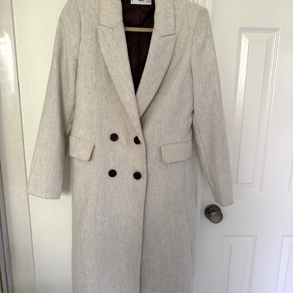 Stylish and classy double-breasted wool coat is the perfect addition to your winter wardrobe. I would describe the color as heather ivory with grey flecks - very pretty in person! Beautiful, rich chocolate brown lining and chocolate brown buttons on the front, inside button on the inside (see photos).